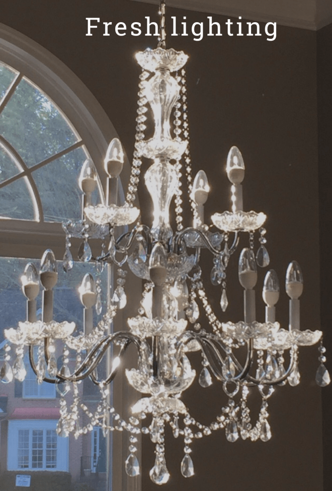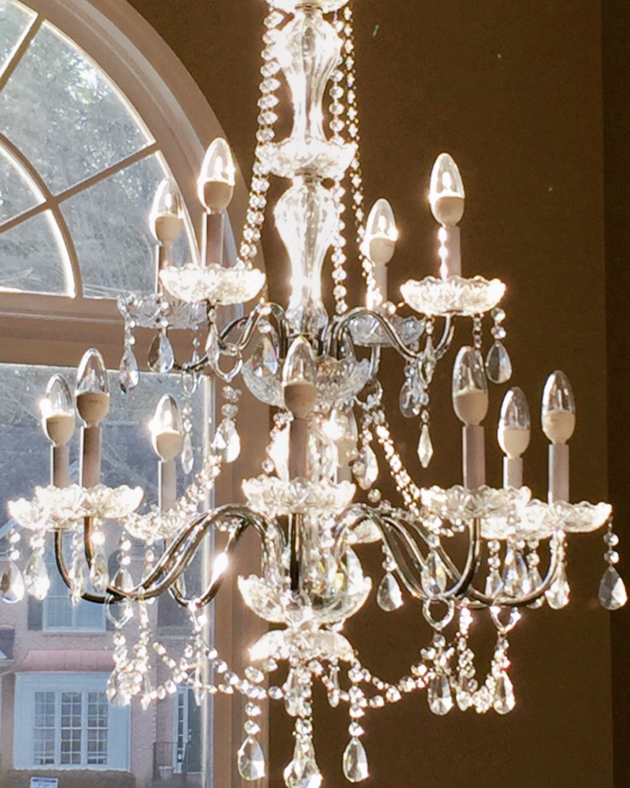 One of the very first changes we made to this house was to update most of the lighting. We had to replace a 1995 gold birdcage (you’ve seen’em) hanging right in front of our window… using a lot scaffolding. The replacement chandelier is solid crystal. I held my breathe on this one.