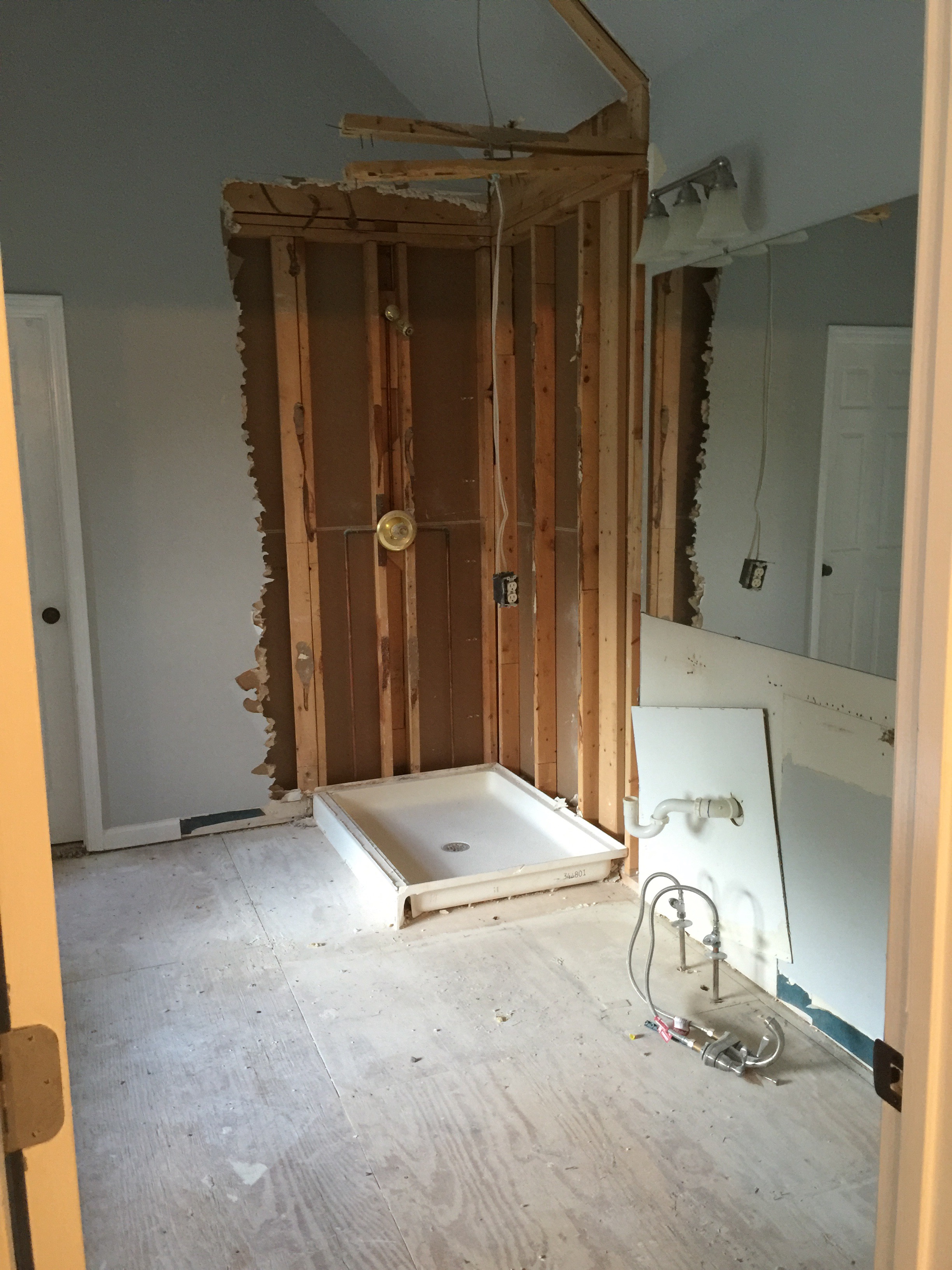 The word of 2016 is greige. And to begin our renovation, we took out a wall and picked these beautiful tile greige floors that would tie the bathroom together.
