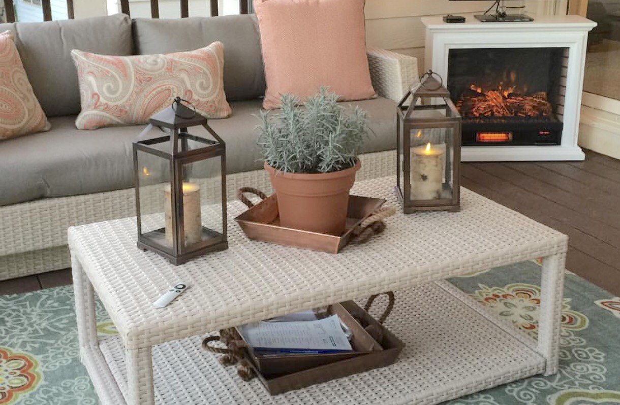 Loving the colors in this styled screened back porch complete with remote control heater/fireplace, TV, and twinkle lights. It works for Fall and Spring and all the seasons in between.