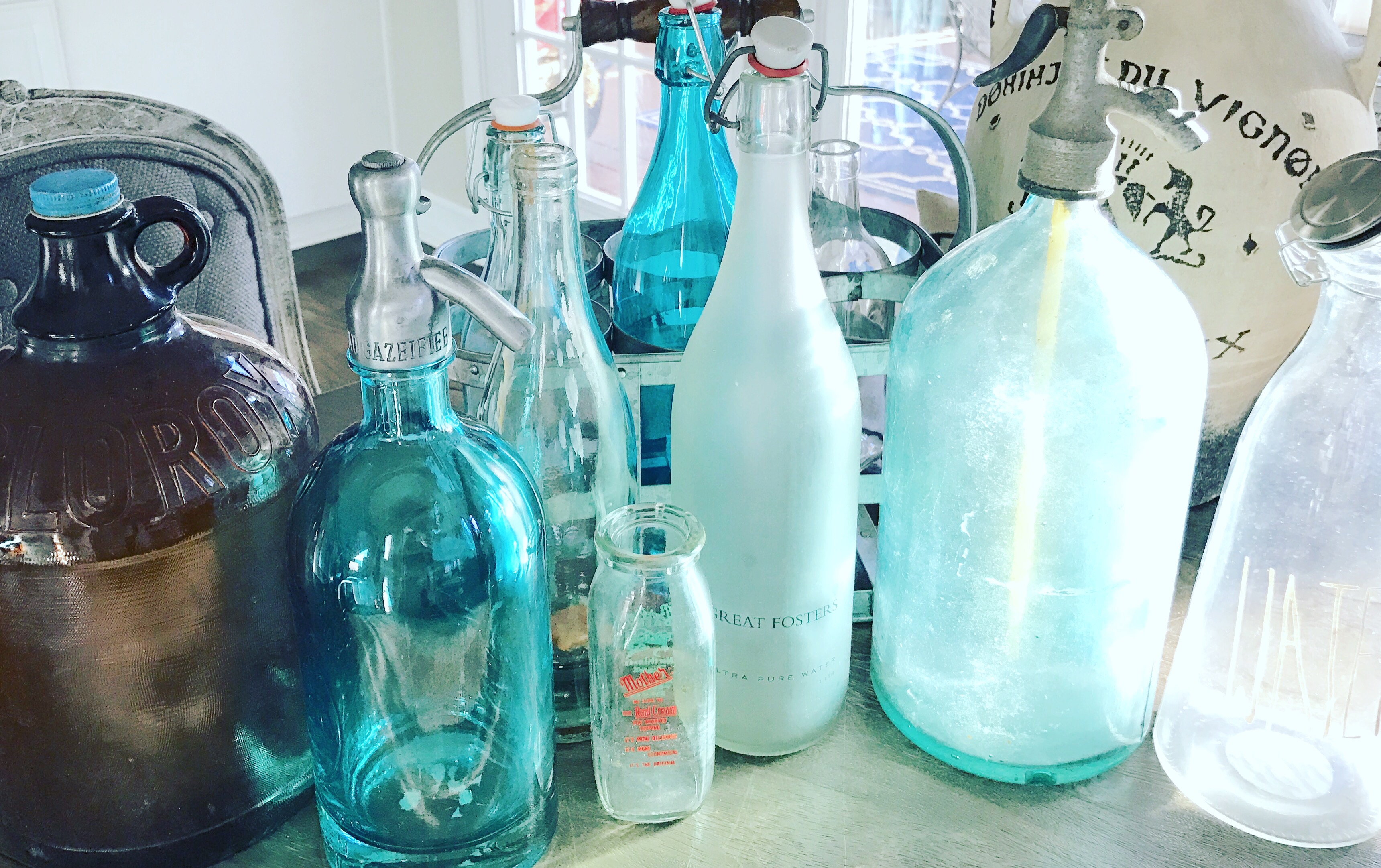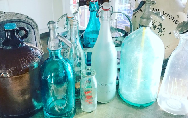 Vintage and vintage-like bottle love… and there’s more. EEEK! Found these in the basement – though maybe lost in our move. Whew! My favorite is the true vintage blue seltzer bottle found here in Atl a few years ago along with the old Clorox bottle. The other seltzer bottle is a recent find from homegoods. Many of the others are bottles from traveling – no label wine bottle from dinner in Dijon, a glass water bottle from a trip to Surrey, etc. Lovely bottles, lovely memories.