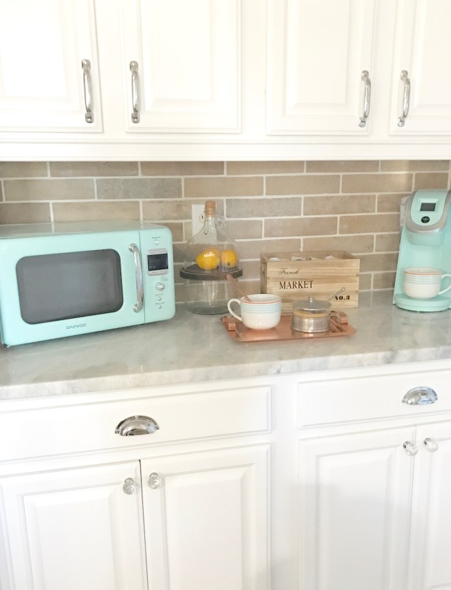 Happy Friday! I’m having my afternoon coffee, and I remembered I said I would post my microwave. Yes, I know… I’m posting a photo of a microwave. EEEK! But, it’s the cutest microwave I’ve ever seen. We renovated the kitchen and I didn’t want a big microwave really… anywhere, so I started looking and found this little cutie vintage style. It’s very small, energy efficient – turns off when not in use. They also make it in white (which I may get at some point) and red, but this one matches the kitchen stools, Keurig and KitchenAid. Anyhoo – here it is.. my pop of color.
