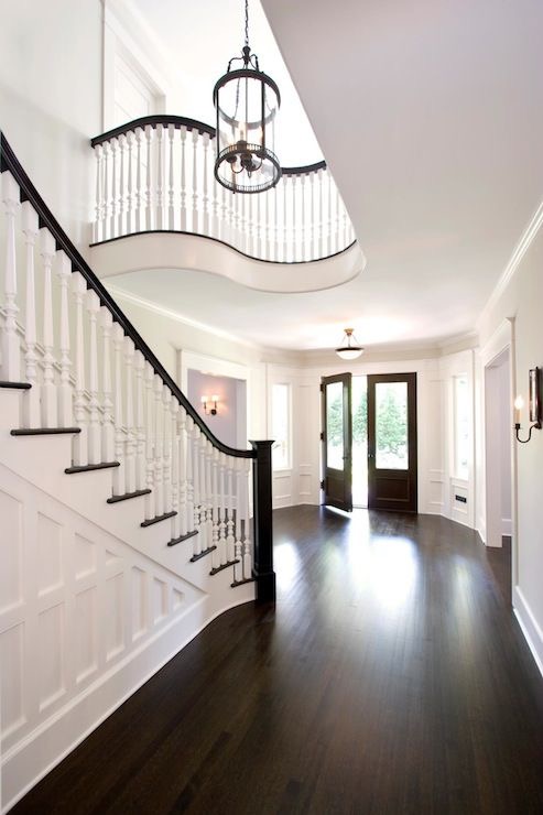 Well right now our walls are a greige. We inherited the color when we bought the house. It’s a pretty color but I’m getting tired of it by the minute. It’s just too much color for me and we have high ceilings so it just goes on and on. We have dark wood floors, and I recently stained our honey oak railing a very dark brown almost black color and kept the spindles a bright white. Seeing this photo and a few others is the inspiration I needed to go really white. I’ve really wanted to do dark floors, white walls. I’m so ready!!