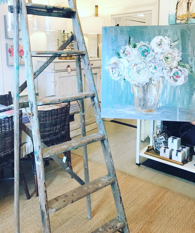 Today I found this great rustic, vintage ladder (they had a few different ones) and fell head over for this delightful, stunning original painting. And… they match. It’s almost as if the artist was using this ladder in her studio for the painting. I took both pieces on consignment (just love that!) to see if they will work where I’m hoping… If not, I think the painting will find a place in my home somewhere, somehow, and I’ve got my eye on another ladder.