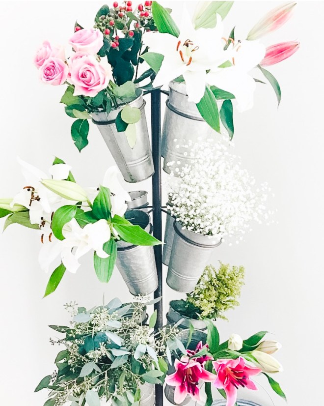 I stopped off at a local furniture, antique store and ended up finding this neat piece to fill with flowers for quick storage before getting them into vases. It reminds me of a little flower market. These are all fresh flowers. I will need to find some dried, or some faux flowers to keep in it more often. This would also be great for parties to label and hold silverware, napkins, and other party items, or really great storage for craft items – a craft tree.