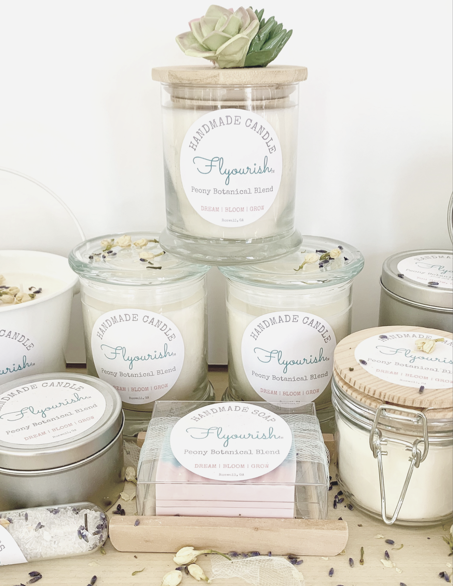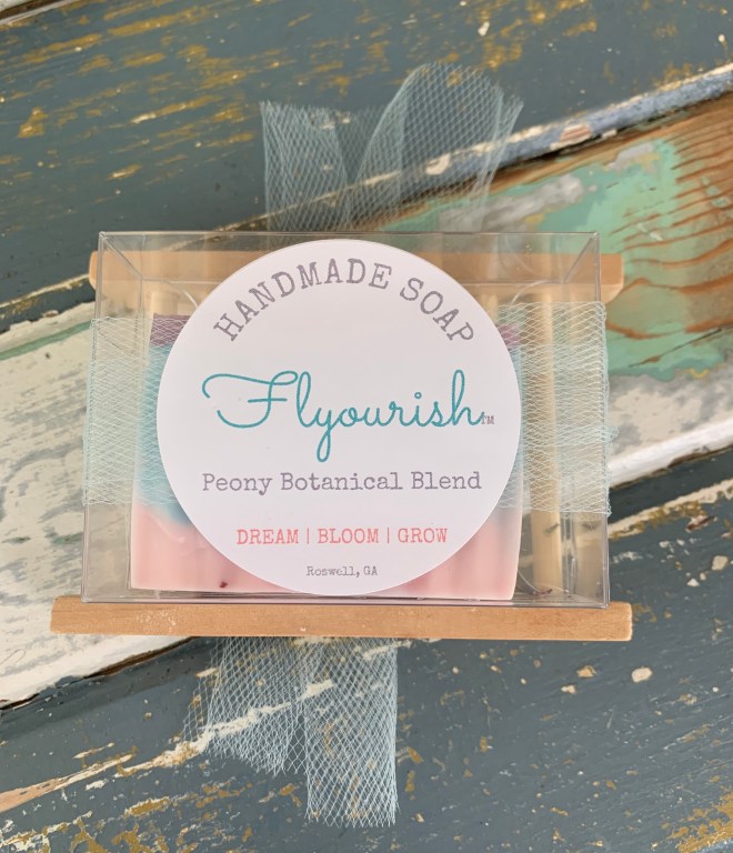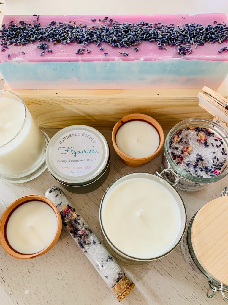 About the soap, it’s a blend of honey and goats milk and the scent is my favorite mix – a Peony Botanical Blend, including lavender and jasmine. These candles are a Eucalyptus + Mint and a Peony Botanical Blend. I’ve also created a dried flower bath salt blend with essential oils.
