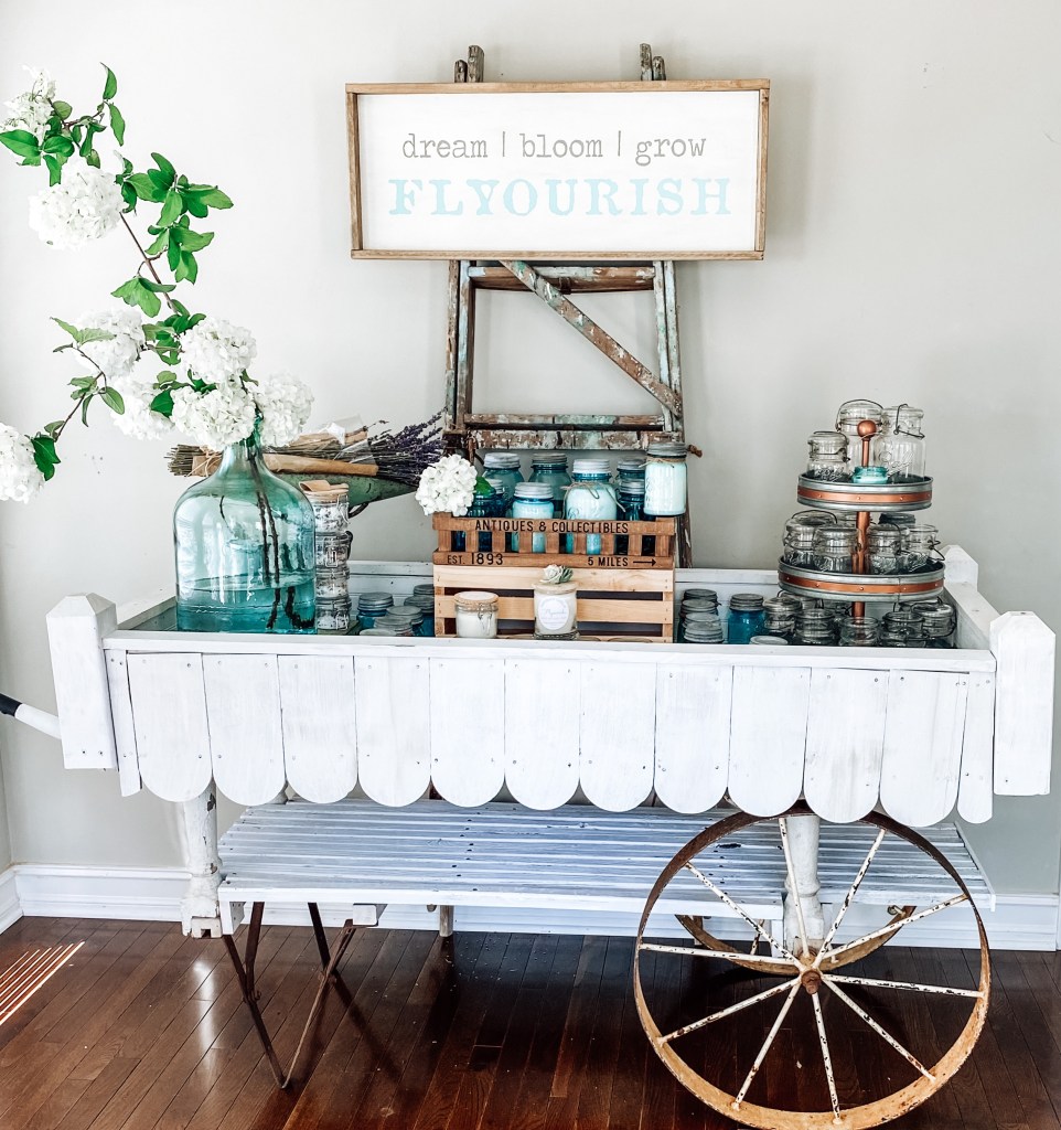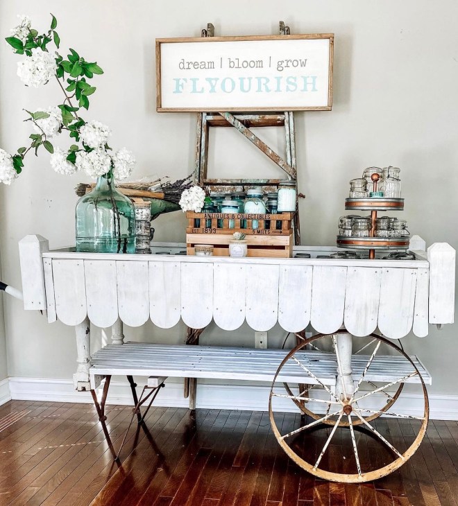 Flower cart, garden cart, candle cart. Whatever it is, I’m lovin it. I bought this vintage cart last October while out antiquing. I fell in love with it. It is handmade using old wood from a fence, shutters, a swing, and the handles are gardening shears… how cute is that! It’s big and functional, though heavy, and at some point it may go in the greenhouse, but for now it’s my candle/garden cart for the studio space. Lovin’ it. What’s your fave vintage find?!